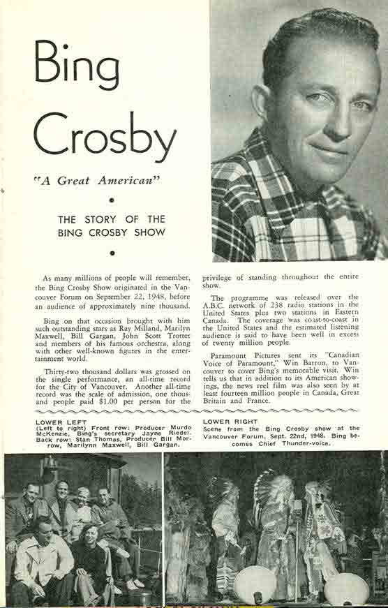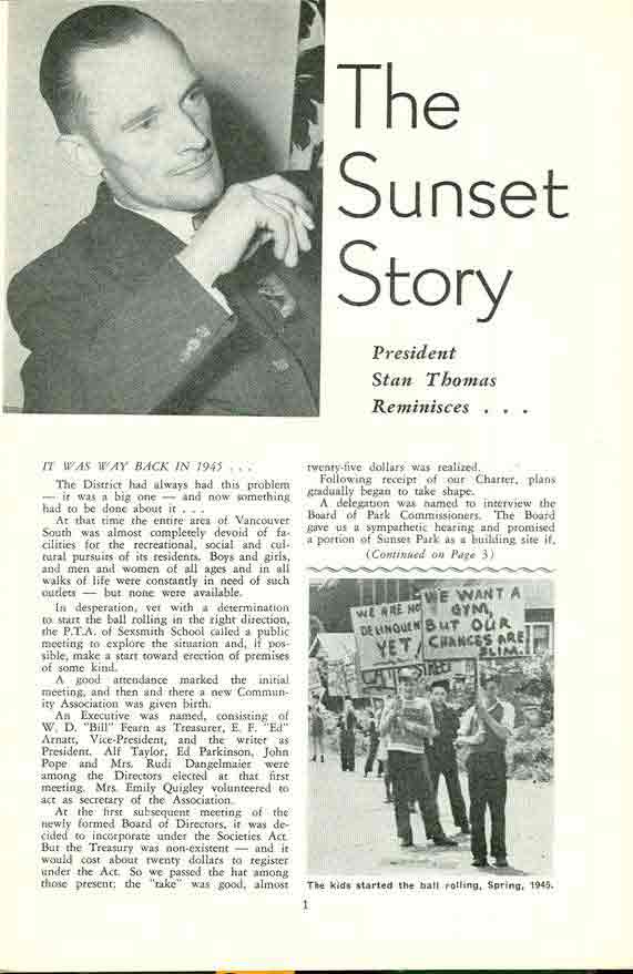Stan Thomas, President of the Sunset Association in 1947, was sent to Hollywood California to convince Bing Crosby to stage his radio show in Vancouver as a benefit for the construction of Sunset Community Centre.